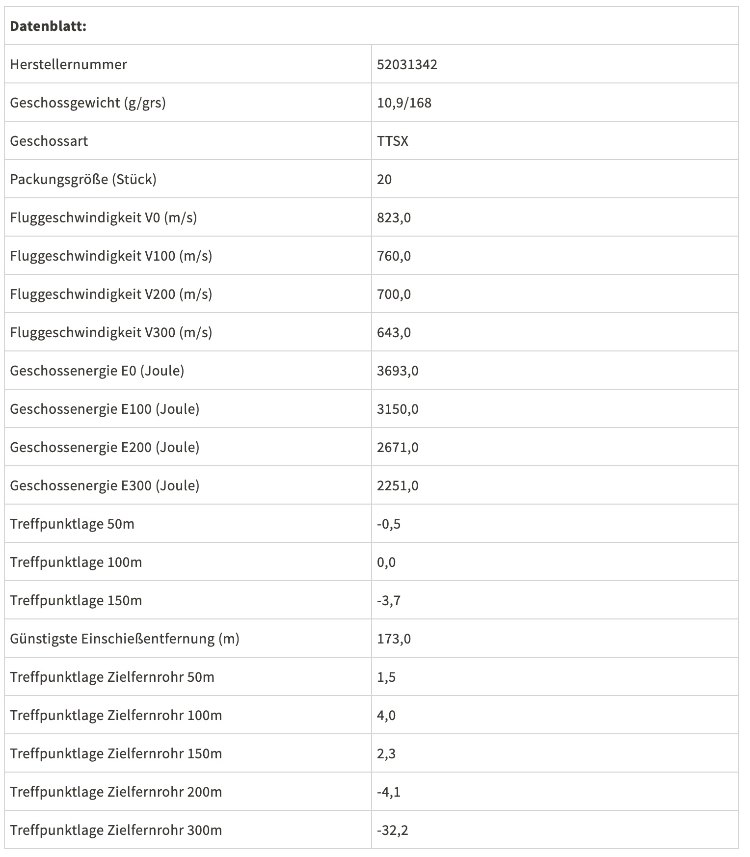 TTSX = Tipped Tripple Shock X bleifreies Geschoss, Weiterentwicklung des TSX Geschosses mit einer blauen Polymerspitze. Eine schnellere Expansion beim Auftreffen auf den Wildkörper und eine Verbesserung der Präzision, speziell auf weitere Entfernungen sind die Vorteile dieser neuen Geschossinnovation.