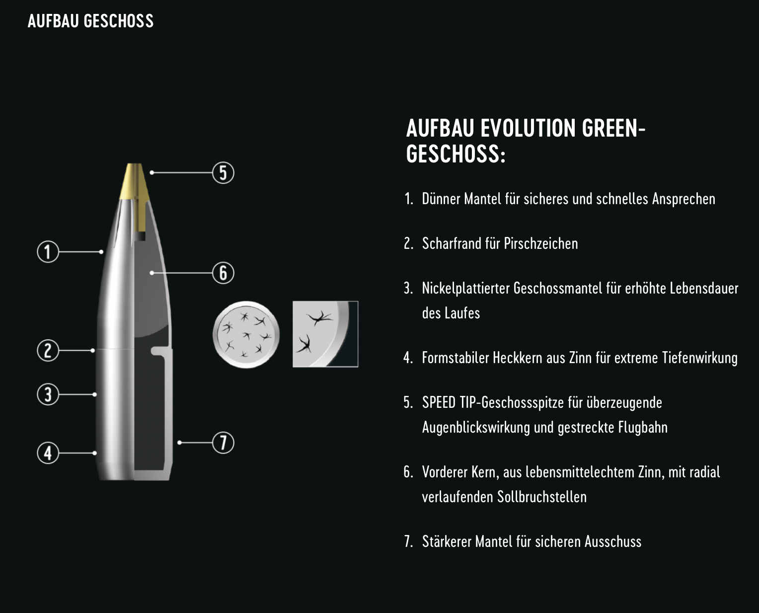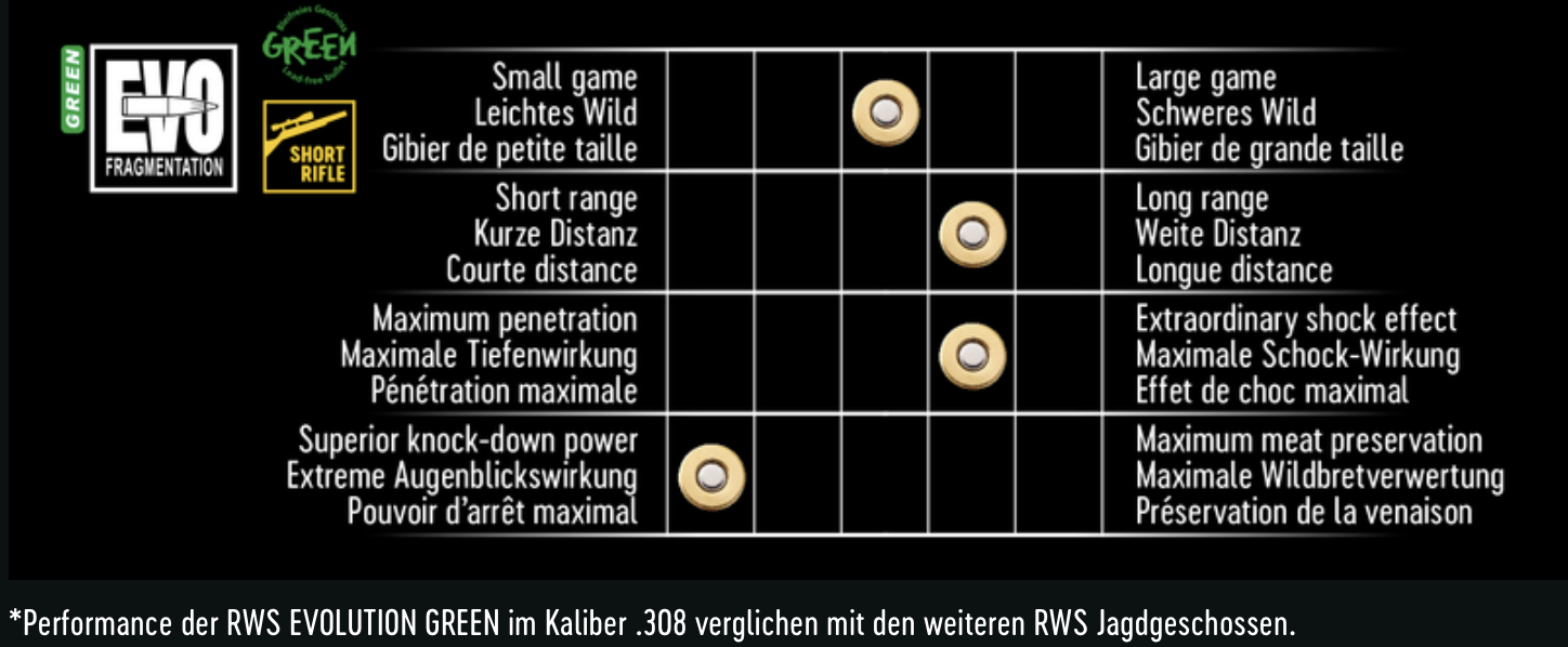 Das RWS EVOLUTION GREEN ist ein bleifreies Teilzerlegungsgeschoss mit einer Reihe von aufeinander abgestimmten Konstruktionsmerkmalen. Die beiden Geschosskerne sind aus lebensmittelechtem Zinn. Das Geschoss eignet sich für alle heimischen Wildarten, spielt seine Stärken jedoch am besten im Bereich leichtes bis mittelschweres Wild aus. Der Wirkungsvorteil des bleifreien EVOLUTION GREEN Geschosses liegt im herausragenden Ansprechverhalten, das durch eine Mehrfachlochung des vorderen Zinnkerns erzielt wird, sowie der Speed-Tip Geschossspitze für eine überzeugende Augenblickswirkung. Daraus resultieren für den Jäger deutlich kürzere Fluchtstrecken und weniger Nachsuchen.
