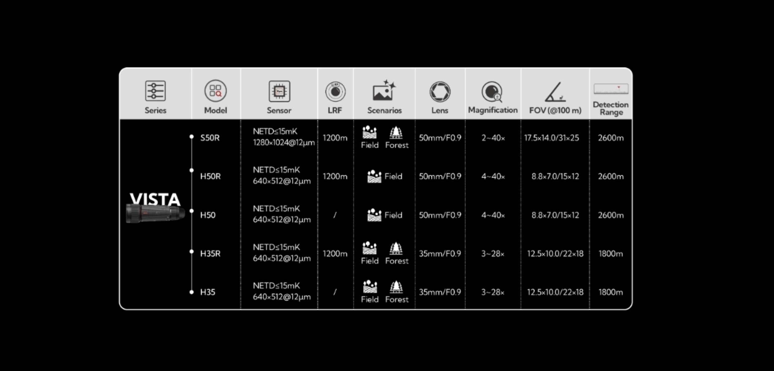 VISTA-Wärmebildkameras sind für verschiedene Anwendungen wie Jagd, Beobachtung, Sicherheit, Orientierung im Gelände, Such- und Rettungseinsätze usw. geeignet.
