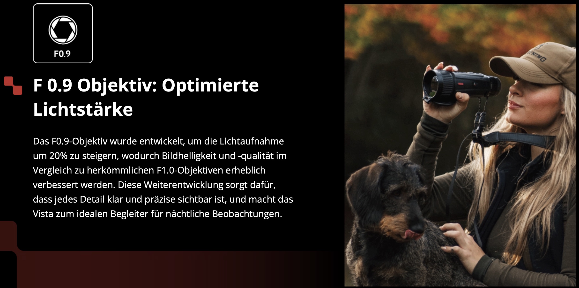 Das F0.9-Objektiv wurde entwickelt, um die Lichtaufnahme um 20% zu steigern, wodurch Bildhelligkeit und -qualität im Vergleich zu herkömmlichen F1.0-Objektiven erheblich verbessert werden. Diese Weiterentwicklung sorgt dafür, dass jedes Detail klar und präzise sichtbar ist, und macht das Vista zum idealen Begleiter für nächtliche Beobachtungen.