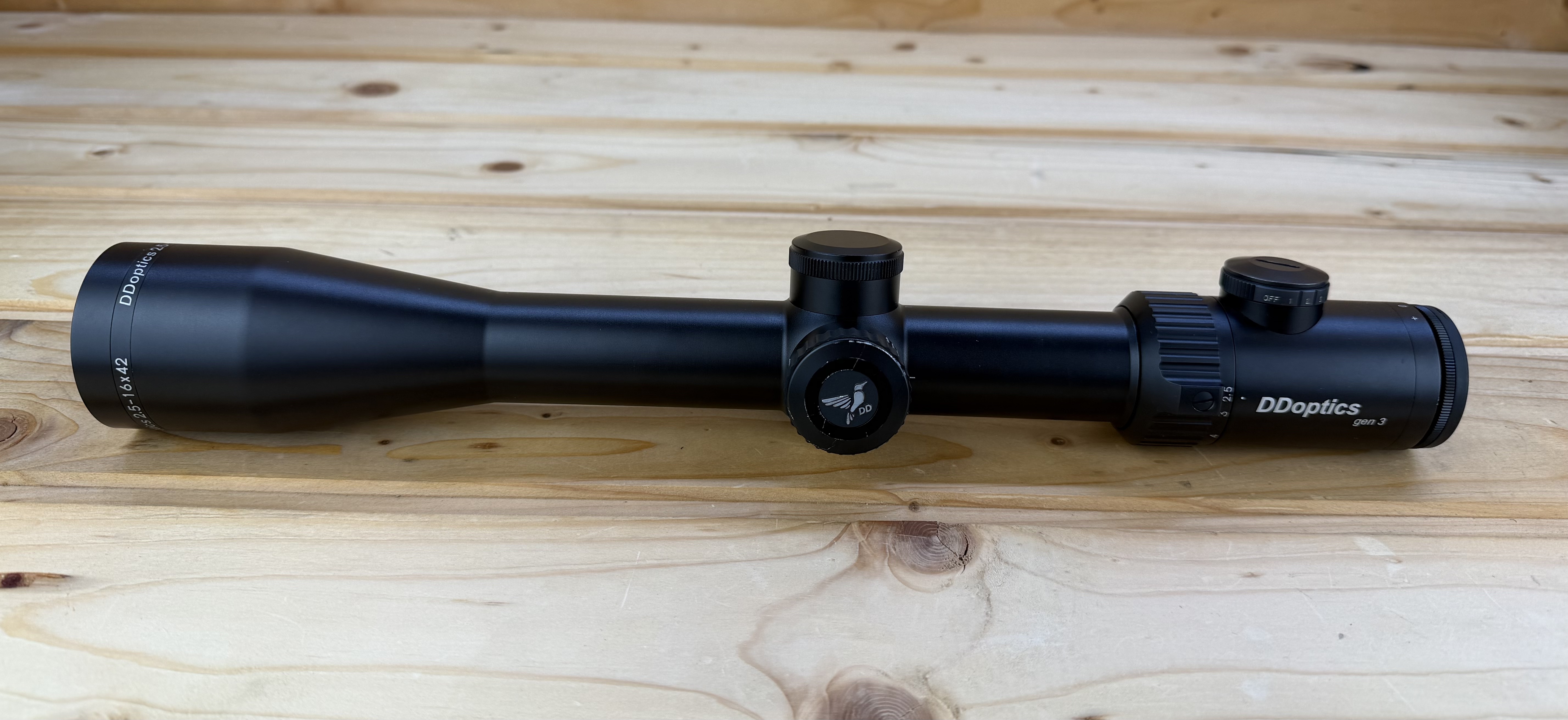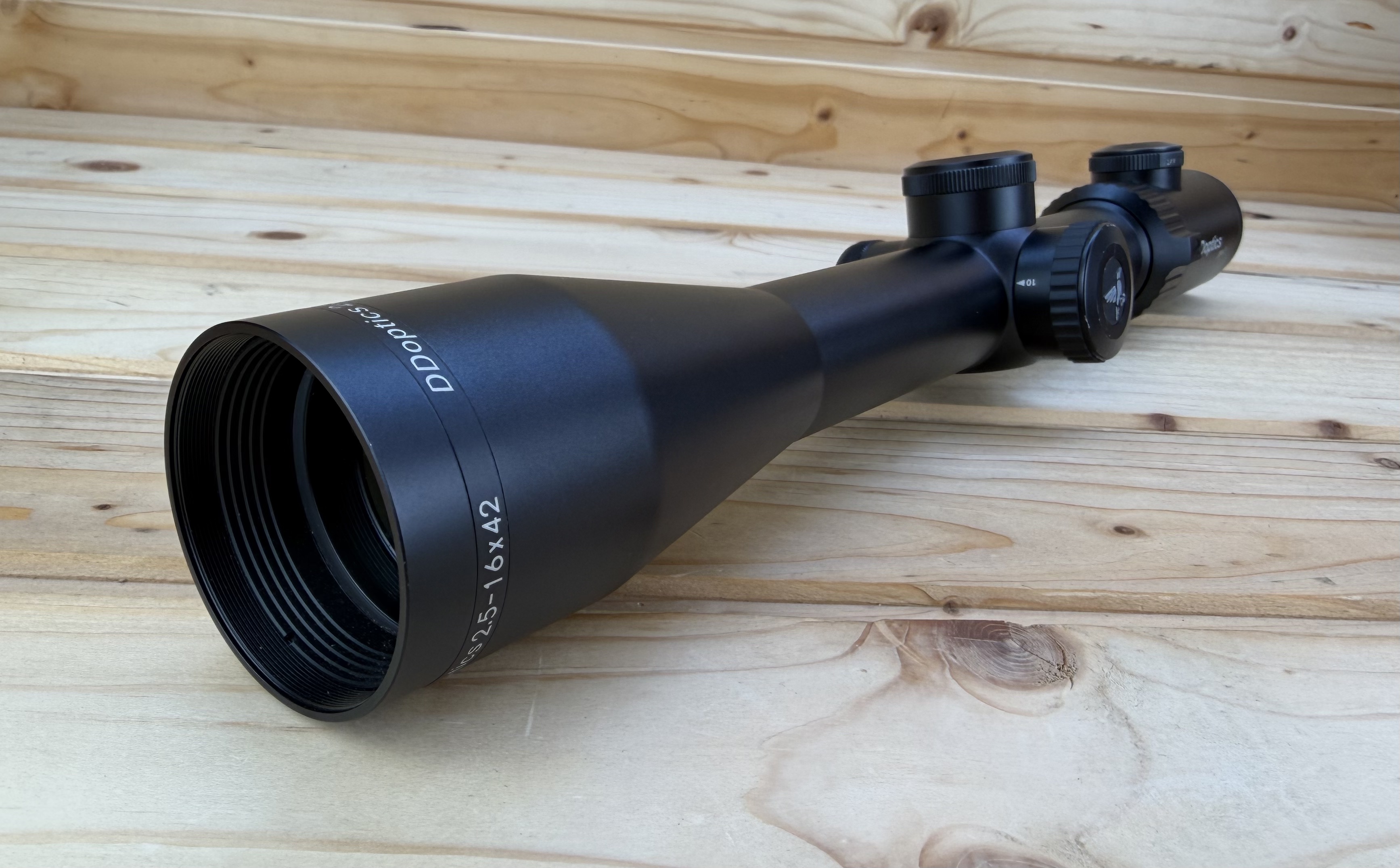Das Zielfernrohr V6 2,5-16x42 der 3. Generation von DDoptics besteht aus einer robusten Aluminiumlegierung, ist stoßfest und frei von Kunststoffteilen. Alle Aluminiumteile sind mit einer nicht glänzenden „fine black“-Eloxierbeschichtung versehen. Die Optik brilliert durch hochleistungsfähiges CT-Glas (Clear Transmission), das einen hellen und klaren Durchblick garantiert und damit selbst bei 16-facher Vergrößerung ein kontrastreiches, parallaxefreies und farbtreues Bild mit herausragenden Randschärfeeigenschaften und hervorragende Transmission bietet. Mit einem Sehfeld von 14 m bzw. 2,5 m (bei 2,5- bzw. 16-facher Vergrößerung) eignet sich die Optik für jeden jagdlichen Einsatz.