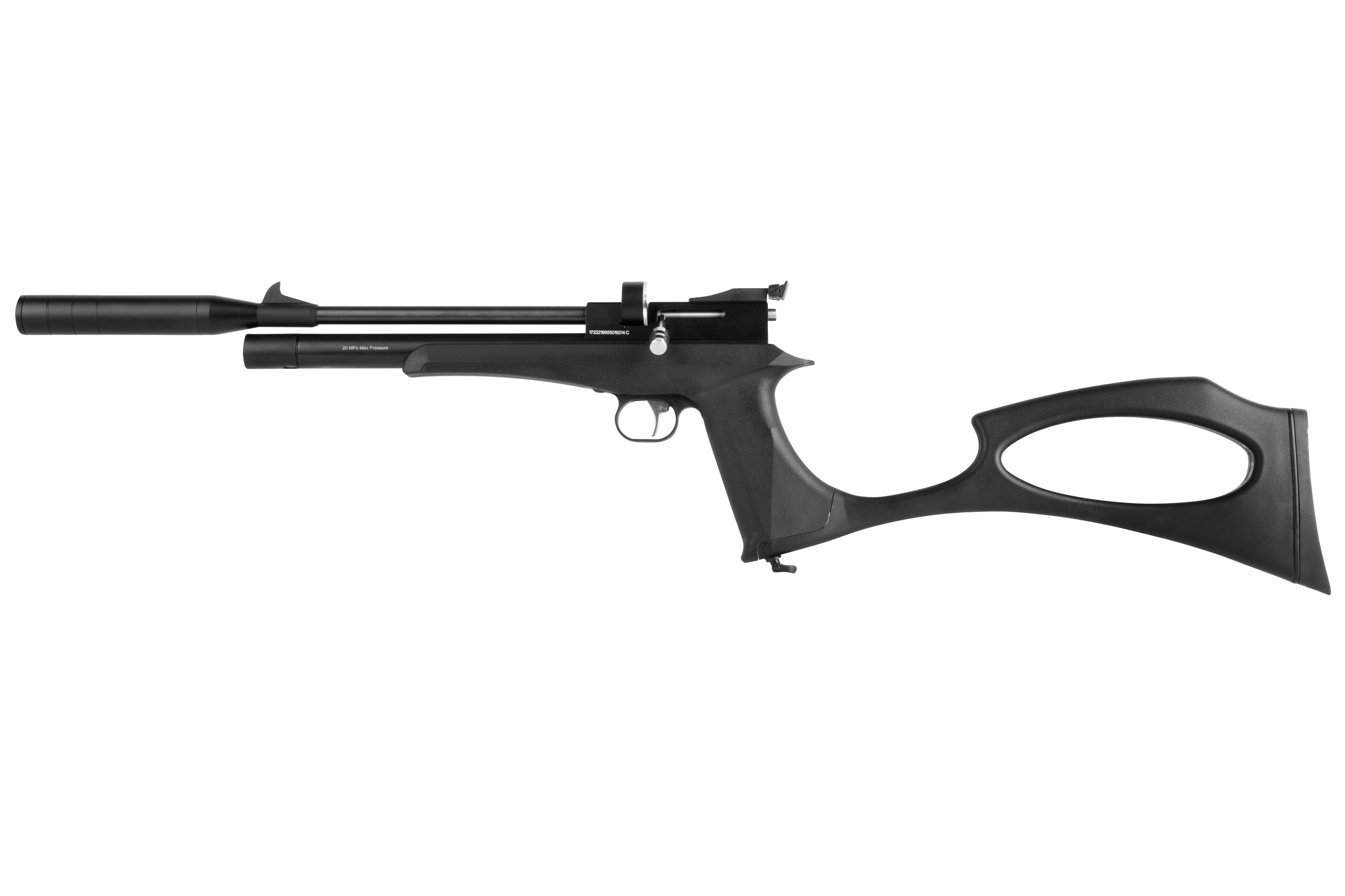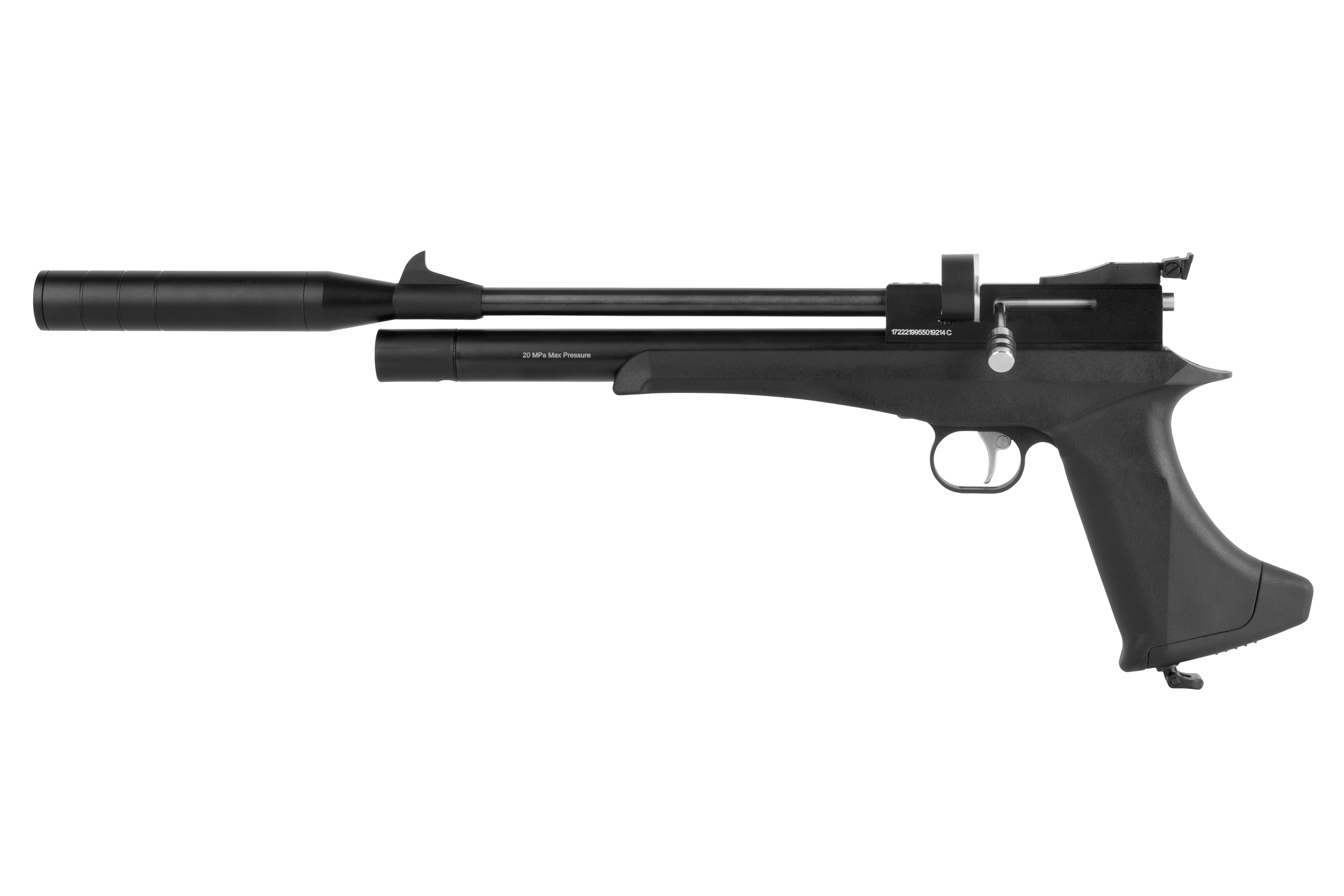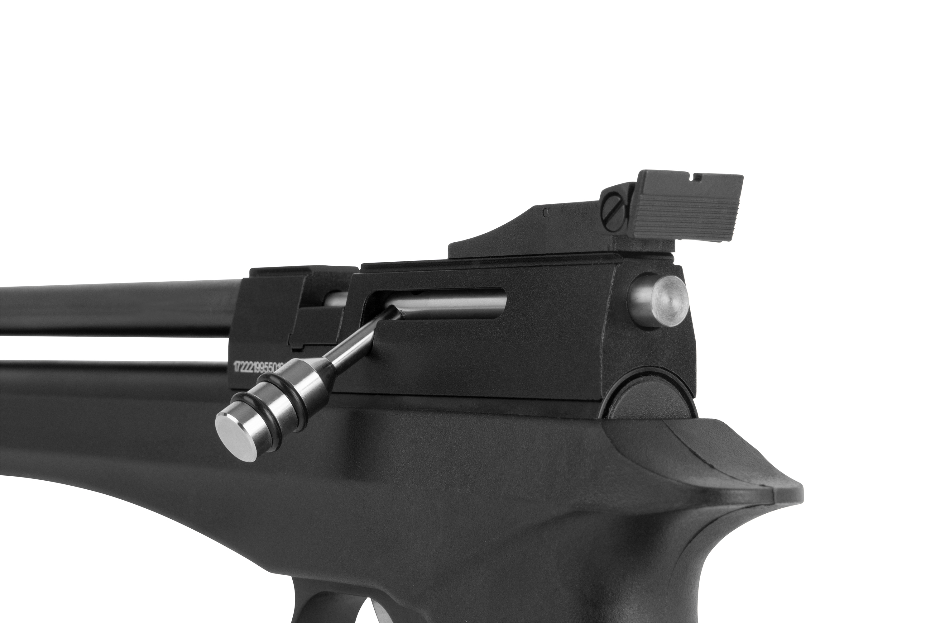 Die DIANA bandit mit integriertem Regulator ist eine leistungsstarke Pressluft-Pistole mit abnehmbarer Schafterweiterung und aufgedrehtem Schalldämpfer. Die Pistole kann mit einer Einlage im Einzelschuss-Modus und mit einem 9-Schuss Trommelmagazin betrieben werden. Die gefräste Prismenschiene ermöglicht den Anbau einer passenden Optik. Der maximale Fülldruck beträgt 200 bar.