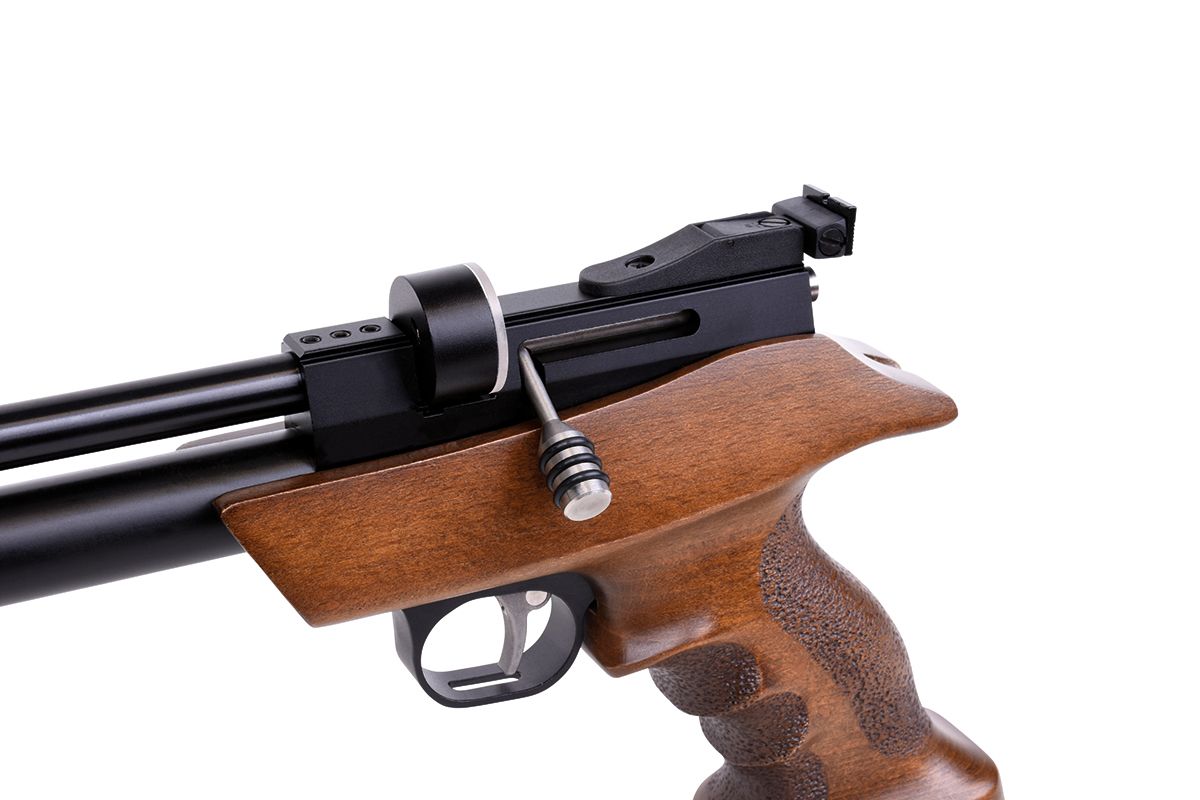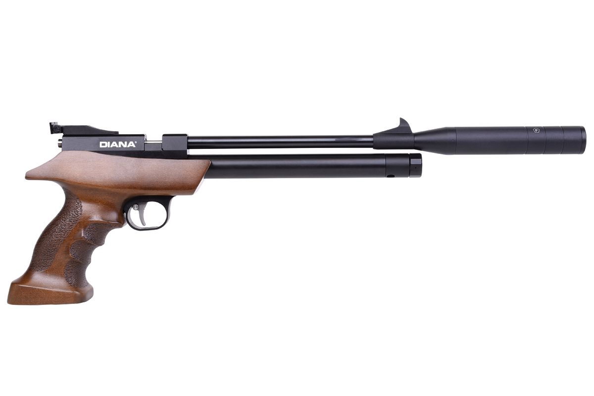 Die DIANA bandit mit integriertem Regulator ist eine leistungsstarke Pressluft-Pistole mit ergonomischen Buchenholz-Griffstück und aufgedrehtem Schalldämpfer. Die Pistole kann mit einer Einlage im Einzelschuss-Modus und mit einem 9-Schuss Trommelmagazin betrieben werden. Die gefräste Prismenschiene ermöglicht den Anbau einer passenden Optik. Der maximale Fülldruck beträgt 200 bar.