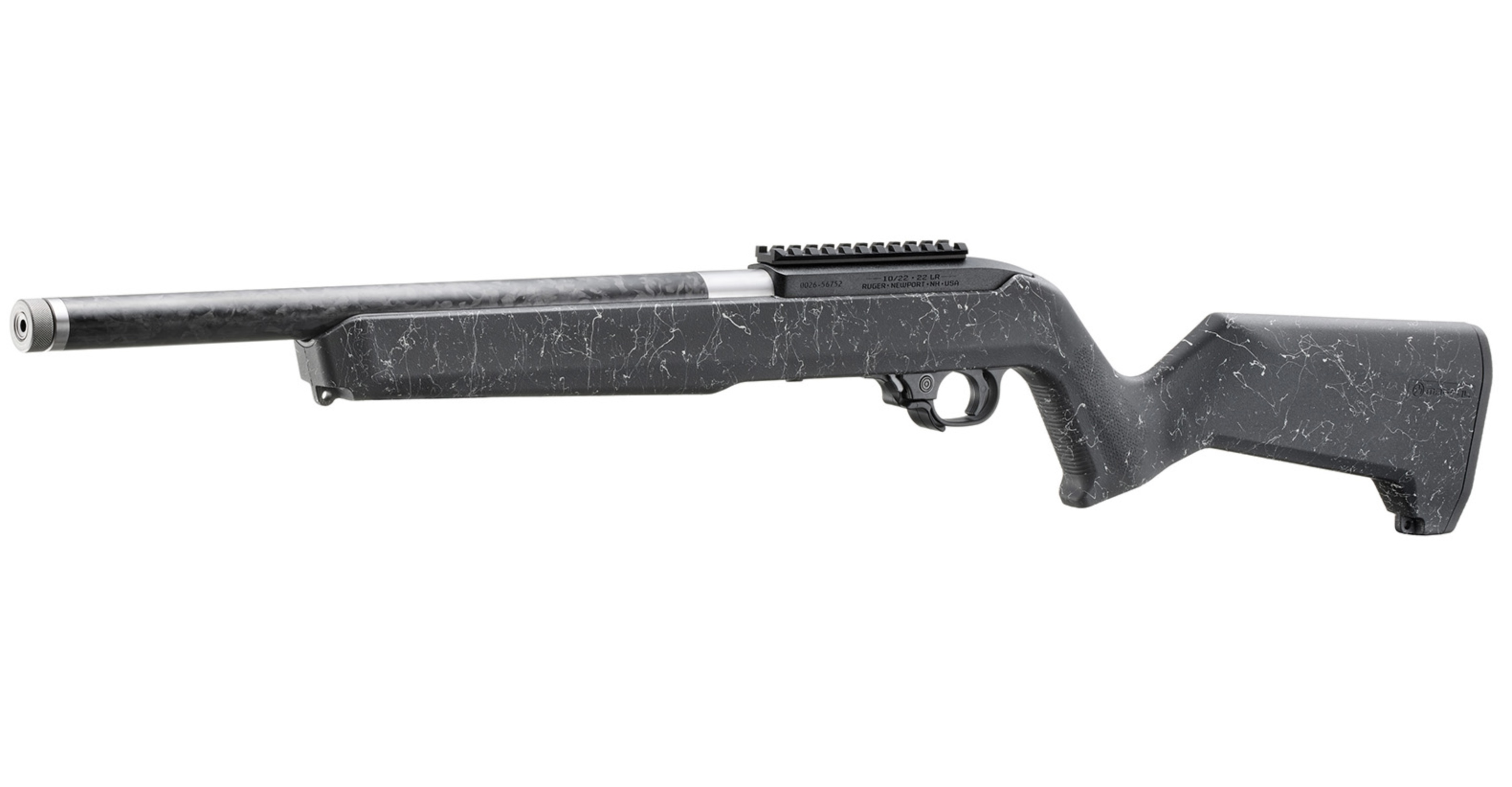 Mit einem Gewicht von gerade einmal 1,59 Kilogramm ist es das leichteste 10/22®-Modell und verfügt über einen 16,1 Zoll langen, kaltgehämmerten Lauf mit einem Kohlefasermantel. Zusätzlich zur Gewichtsreduzierung ist der Lauf aus Edelstahl steifer, wodurch Vibrationen reduziert werden, und verfügt über ein 1/2"-28-Gewinde für die Anbringung von Mündungsvorrichtungen.