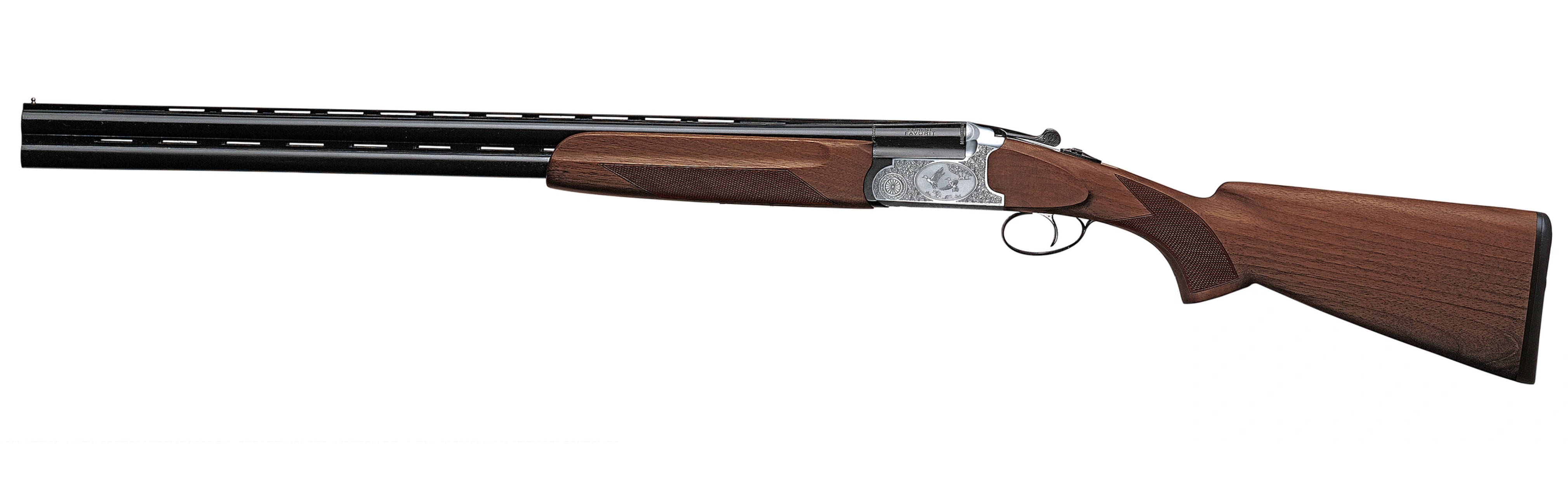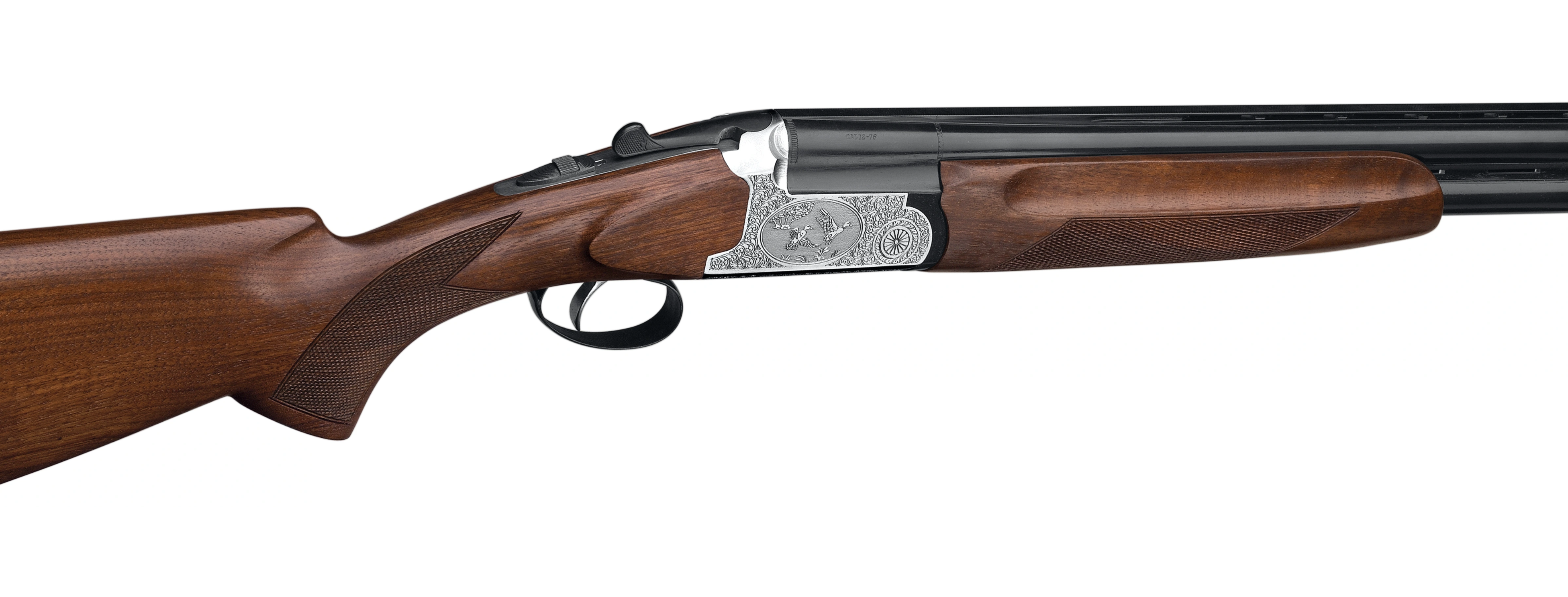 Des Weiteren kann bei Bockflinten durch den gradlinigeren Rückstoß der zweite Schuß etwas schneller abgegeben werden. Optisch handelt es sich bei dieser Serie um besonders schöne Flinten mit ventiliertem Laufbündel und einer gravierten Basküle mit Jagdmotiv. Die Lauflänge beträgt 71 cm, was der Handhabung dieser Waffe im vielseitigen Jagdbetrieb entgegen kommt. Der Einabzug mit mechanischer Umschaltung ist sehr praktisch und macht eine zügige Schussfolge möglich. Das Blitzsystem mit einer Abzugssicherung auf dem Kolbenhals ist schnell erreichbar. Der Schaft ist aus schönem Nussbaumholz gefertigt.